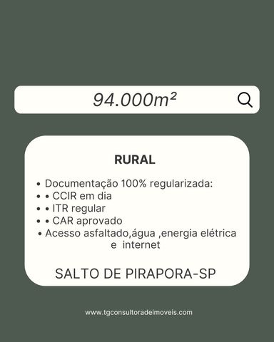 Excelente área com 94.000 m², localizada em região estratégica e altamente valorizada, ideal para investidores e empresas que buscam espaço, acessibilidade e infraestrutura completa. O terreno apresenta pequeno declive natural, favorecendo projetos de terraplenagem, drenagem e implantação de empreendimentos com ótimo aproveitamento da área. Diferenciais de localização e infraestrutura: • Acesso totalmente asfaltado • Água, energia elétrica e internet disponíveis • Transporte público nas proximidades • Região com vocação para crescimento e desenvolvimento Indicação de uso: • Instalação de empresas e centros operacionais • Loteamentos residenciais ou industriais (mediante viabilidade urbanística) • Centro de treinamento, clubes, estruturas educacionais ou corporativas • Projetos logísticos, institucionais ou de lazer Documentação 100% regularizada: • CCIR em dia • ITR regular • CAR aprovado • Imóvel apto para negociação segura e imediata Uma oportunidade única para quem busca área ampla, bem localizada e pronta para receber grandes projetos, com segurança jurídica e excelente potencial de valorização. Ligue e agende sua vista e converse com nossos especialistas.