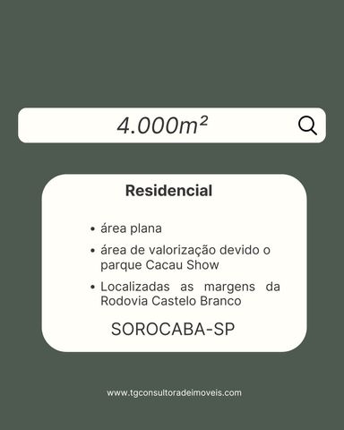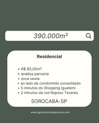 Área à Venda – Sorocaba/SP Excelente área com 390.000 m², localizada em uma das regiões que mais se desenvolvem de Sorocaba, com fácil acesso à Rodovia Raposo Tavares e proximidade ao Shopping Iguatemi. Valor: R$ 85,00/m² Ideal para loteamento – região em plena expansão, com alto potencial de valorização. Ao lado de condomínio residência! Analisa parceria Oportunidade imperdível para investidores e incorporadoras que buscam uma área estratégica, com excelente custo-benefício e grande projeção de crescimento.