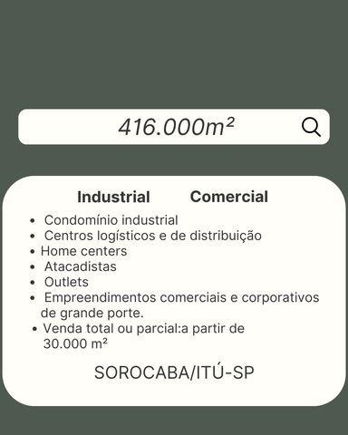ÁREA COMERCIAL / INDUSTRIAL – ITU | SOROCABA – SP Dados Gerais do Ativo • Área total: 416.000 m² • Modalidade: Venda total ou parcial • Metragens disponíveis: a partir de 30.000 m² • Valor: R$ 280,00 / m² • Localização: Rodovia Itu–Sorocaba • Municípios: Itu / Sorocaba • Situação: Inserida em perímetro urbano ⸻ Destaques Estratégicos da Localização • Frente ampla para rodovia, garantindo alta visibilidade comercial • Área inserida em perímetro urbano consolidado • Excelente conectividade com os principais eixos rodoviários do estado: • Rodovia Santos Dumont • Rodovia Castelo Branco • Rodovia Marechal Rondon •. Rodovia Raposo Tavares – • Fácil acesso ao Aeroporto Internacional de Viracopos ⸻ Vizinhança Corporativa e Industrial Área localizada em região altamente consolidada, ao lado de grandes players industriais e corporativos, com infraestrutura estabilizada e forte vocação para empreendimentos de médio e grande porte. ⸻ Perfil e Potencial de Desenvolvimento Área extremamente versátil, ideal para implantação de: • Condomínio industrial • Centros logísticos e de distribuição • Home centers • Atacadistas • Outlets • Empreendimentos comerciais e corporativos de grande porte ⸻ Infraestrutura Urbana Disponível • Gás natural • Transporte coletivo • Coleta de lixo • Região totalmente inserida no perímetro urbano ⸻ Parâmetros Urbanísticos – Município de Itu • Zona Industrial (ZI) • Taxa de ocupação: 70% • Zona do Corredor Comercial 3 (ZCC3) • Taxa de ocupação: 70% • Zona de Predominância Residencial 2 (ZPR2) • Até 2 pavimentos: 70% • De 3 a 4 pavimentos: 50% Endereço, fotos, arquivo KMZ e demais informações da área serão fornecidos mediante contato com nossos corretores. Entre em contato para mais detalhes. Temos outras áreas disponíveis.