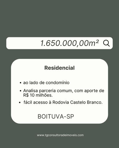 Área à Venda – Boituva/SP Área Estratégica à Venda – Boituva/SP | 1.650.000 m² Excelente área com 1.650.000 m², localizada em uma das regiões que mais se desenvolvem em Boituva, ao lado de condomínios consolidados e com fácil acesso à Rodovia Castelo Branco. Valor: R$ 50,00/m² Vocação: Ideal para loteamento residencial Região em plena expansão, com alto potencial de valorização Condições: Analisa parceria comum, com aporte inicial de R$ 10 milhões. Oportunidade imperdível para investidores e incorporadoras que buscam uma área estratégica, com excelente custo-benefício e grande projeção de crescimento no interior paulista. Endereço, fotos, arquivo KMZ e demais informações da área serão fornecidos mediante contato com nossos corretores. Entre em contato para mais detalhes. Temos outras áreas disponíveis.
