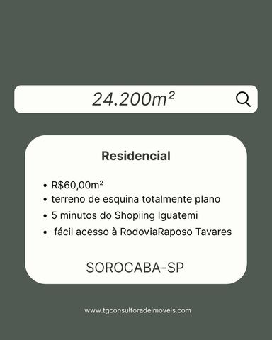 Área à Venda – Sorocaba/SPE Excelente área com 24.200 m², localizada em uma das regiões que mais se desenvolvem de Sorocaba, com fácil acesso à Rodovia Raposo Tavares e proximidade ao Shopping Iguatemi. Valor: R$ 60,00/m² Ideal para loteamento – região em plena expansão, com alto potencial de valorização. Oportunidade imperdível para investidores e incorporadoras que buscam uma área estratégica, com excelente custo-benefício e grande projeção de crescimento. Endereço, fotos, arquivo KMZ e demais informações da área serão fornecidos mediante contato com nossos corretores. Entre em contato para mais detalhes. Temos outras áreas disponíveis.