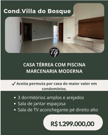 Condomínio Villa do Bosque Casa térrea de alto padrão, com piscina e marcenaria moderna, projetada para oferecer conforto, funcionalidade e sofisticação. O imóvel conta com 3 dormitórios amplos e bem ventilados, ambientes integrados e excelente iluminação natural. A sala de TV com pé-direito alto proporciona sensação de amplitude e aconchego, integrada à sala de jantar espaçosa, ideal para receber. Destaques do imóvel: Casa térrea com projeto contemporâneo Piscina privativa Marcenaria moderna Ambientes amplos e bem distribuídos Ótimo padrão de acabamento Condição especial: aceita permuta por casa de maior valor em condomínios. ***CONDOMÍNIO VILLA DO BOSQUE** Possui espaço para festas, área de brinquedo para as crianças, jardim, espaço gourmet, academia. Vai lhe possibilitar curtir os dias mais quentes na piscina. Encontra-se em um condomínio protegido por muros. Espaço reservado para preparar o seu churrasco. Academia, Churrasqueira, Condomínio fechado, Espaço gourmet, Jardim, Piscina, Playground, Portão eletrônico, Portaria 24h e muito mais. Excelente localização. Venha conhecer! Valor de venda: R$ 1.299.000,00