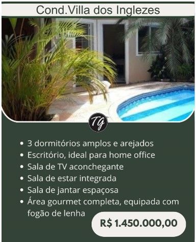 Cond. Villa dos Inglezes • 3 dormitórios amplos e arejados • Escritório, ideal para home office • Sala de TV aconchegante • Sala de estar integrada • Sala de jantar espaçosa • Área gourmet completa, equipada com fogão de lenha R$ 1.450.000,00 ***CONDOMÍNIO VILLA DOS INGLEZES*** Como definir beleza, tranquilidade e infraestrutura em um condomínio residencial cuidadosamente planejado? Simples! Villa dos Inglezes! Imagine morar em um empreendimento com 641.845 m², totalmente preparado para você e sua família! Conte com muito lazer, como playground, campo de futebol, pista de caminhada, quadra de tênis, quadra poliesportiva, academia ao ar livre, quiosque com churrasqueira e muita natureza ao seu dispor! Conte também com muita segurança, com câmeras de monitoramento estrategicamente posicionadas, ronda motorizada full time e portaria 24 hs. Não imagine mais. Venha com a TG fazer seu sonho realidade. Agende uma visita!