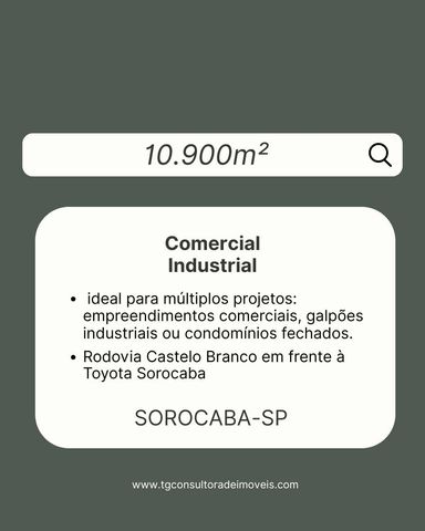 Apresentamos uma área com alto potencial de desenvolvimento, ideal para investidores que buscam retorno sólido e oportunidades de valorização em médio e longo prazo. Área na Rodovia Castelo Branco Km 91 Terreno: 10.900 m² Benfeitoria: Poço artesiano Este terreno oferece: Localização estratégica na Rodovia Castelo Branco , com acesso facilitado . Vocação para múltiplos projetos: empreendimentos comerciais, galpões industriais ou condomínios fechados. Potencial de valorização acelerada, impulsionado por crescimento e investimentos na região. Documentação regularizada, pronta para negociação e desenvolvimento imediato. Agende uma visita! Se você busca um ativo imobiliário com liquidez, escalabilidade e segurança, esta área é a escolha certa para ampliar seu portfólio com inteligência e visão de futuro. Endereço: Rodovia Castelo Branco, km 91, pista sentido interior (quase em frente a Toyota). Endereço, fotos, arquivo KMZ e demais informações da área serão fornecidos mediante contato com nossos corretores. Entre em contato para mais detalhes. Temos outras áreas disponíveis.