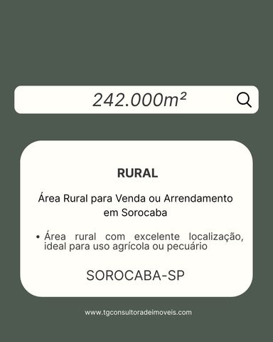 Oportunidade para Investidores – Sorocaba Área rural com excelente localização, ideal para uso agrícola ou pecuário. Arrendamento: 12 alqueires por R$ 7.500,00/mês Venda: 10 alqueires (aproximadamente 242.000 m²) por R$ 13.000.000,00 Terreno estrategicamente situado em região valorizada de Sorocaba, com ótimo potencial de valorização e fácil acesso às principais vias. Agende uma visita!