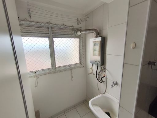 01 área de serviço: piso frio, azulejo: parcial, armário, tanque e janela de vidro com esquadrilha em alumínio