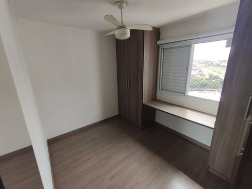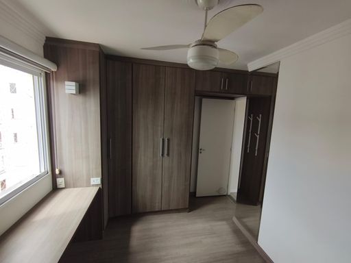 02 dormitórios: ventilador de teto, piso laminado, armários embutidos planejados, esquadrias de alumínio e tela de proteção