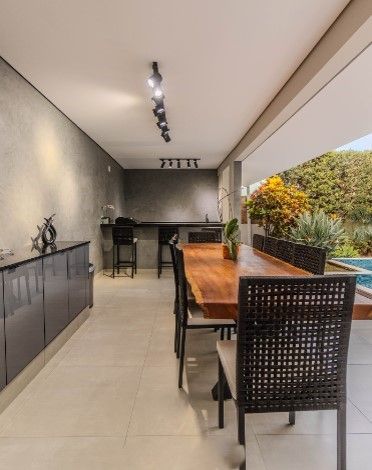 Área gourmet com muito espaço e uma bancada com churrasqueira
