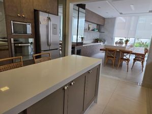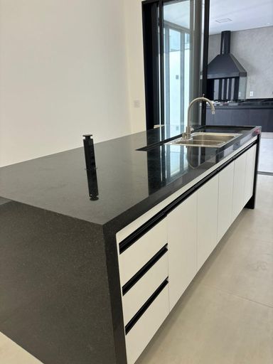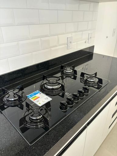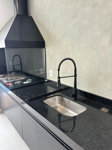 A cozinha espaço gourmet com planejados, fogões cooktop, granito São Gabriel, pias Tramontina.