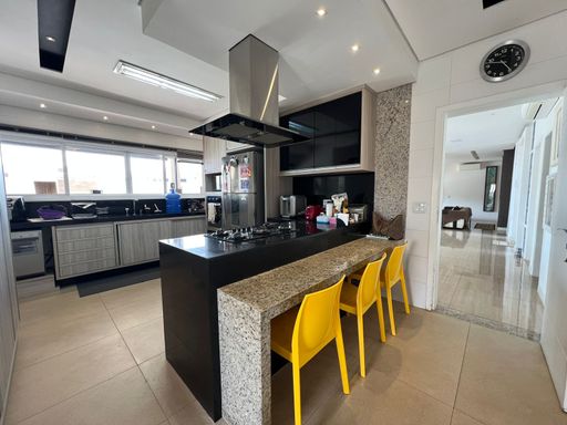 No piso inferior, ampla sala de jantar, sala de estar, sala de tv, adega, escritório e deliciosa cozinha