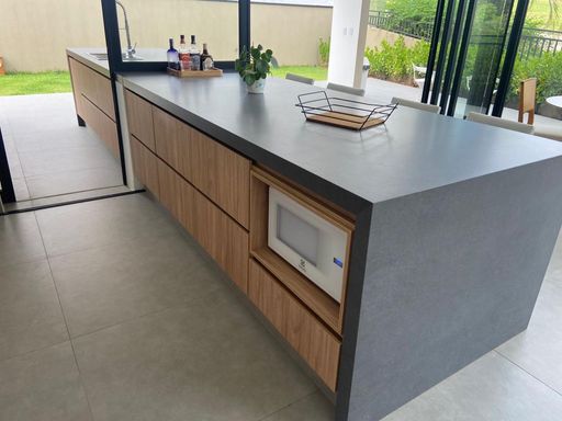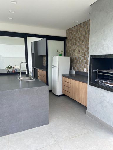 • Espaço gourmet integrado à cozinha, com ilha central