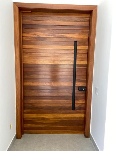• Fachada e porta principal em madeira Cumaru ripada, com fechadura digital