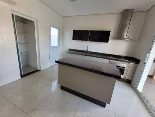 Cozinha com armários, coifa, forno, cooktop e ilha
