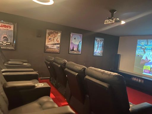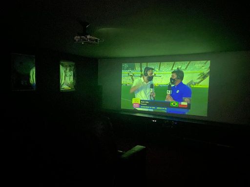 A residência conta com uma sala de cinema particular, perfeita para momentos de entretenimento em família ou com amigos.