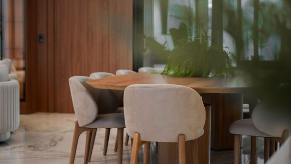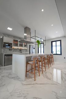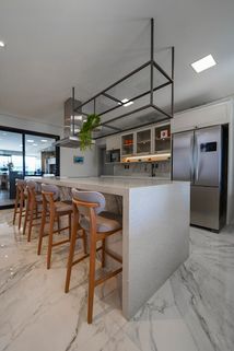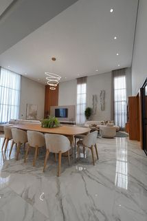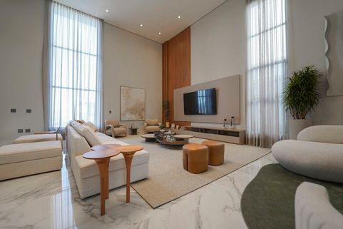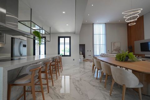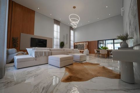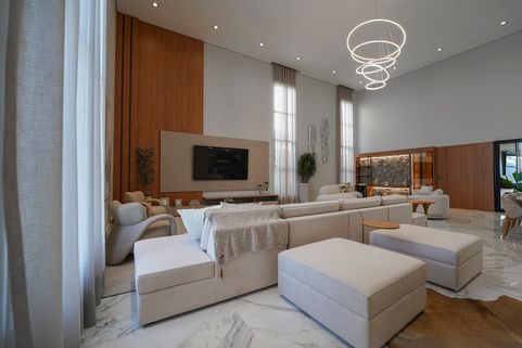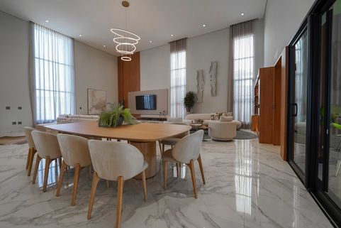 Ampla sala de estar e jantar com pé direito duplo com piso porcelanato polido calacata exceto area gourmet.