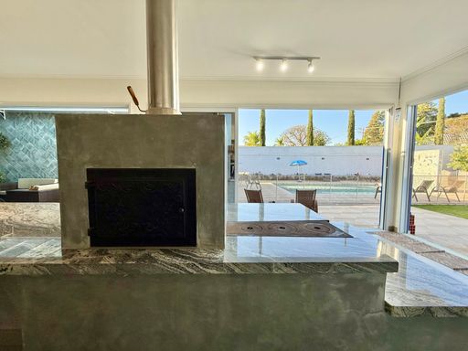 Área gourmet com forno de pizza, fogão a lenha e churrasqueira