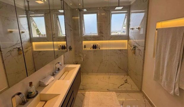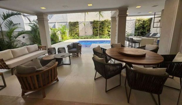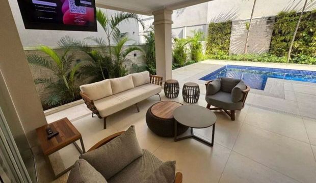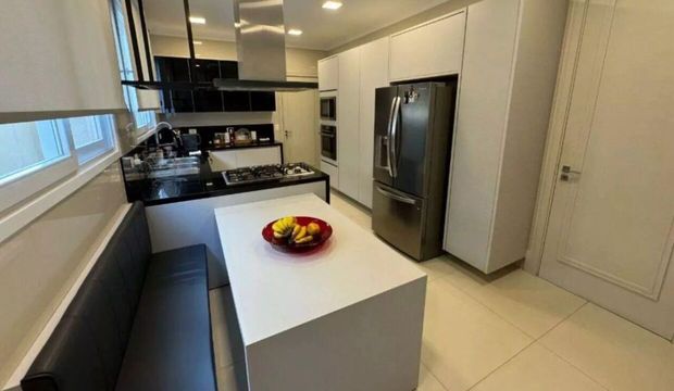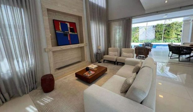 O projeto apresenta 4 suítes, sendo a master com amplo closet, além de living para 3 ambientes, escritório, home theater, lavabo, lareira, ar-condicionado e sistema de som ambiente.