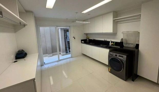 A cozinha, com despensa, é integrada aos espaços sociais e conta com apoio de lavanderia, dormitório e banheiro de serviço.