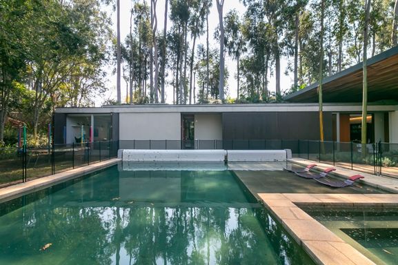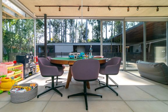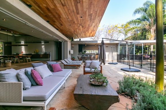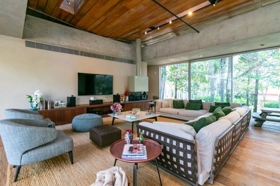 Projeto assinado por Gui Mattos, com ambientes amplos e grandes panos de vidro, que proporcionam um constante diálogo com o verde