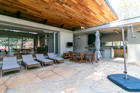 Na parte externa, paisagismo impecável, redes para descanso, mobiliário rústico e um espaço gourmet completo com churrasqueira.