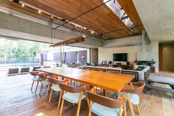 Área social com salas integradas, cozinha equipada com armários Ornare e uma elegante combinação de madeira, natureza e cimento queimado.
