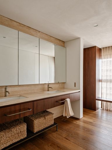 ✔ Suíte master com acabamento em palha de seda e banheiros em travertino natural